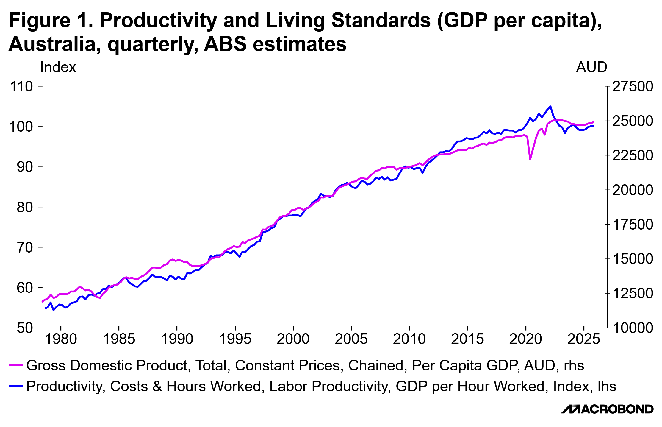 Over long periods, the link between productivity and living standards is clear (Figure 1). As Danielle Wood notes, Australians today enjoy far higher incomes, shorter working hours and better health outcomes than previous generations, largely because productivity has increased over time.
